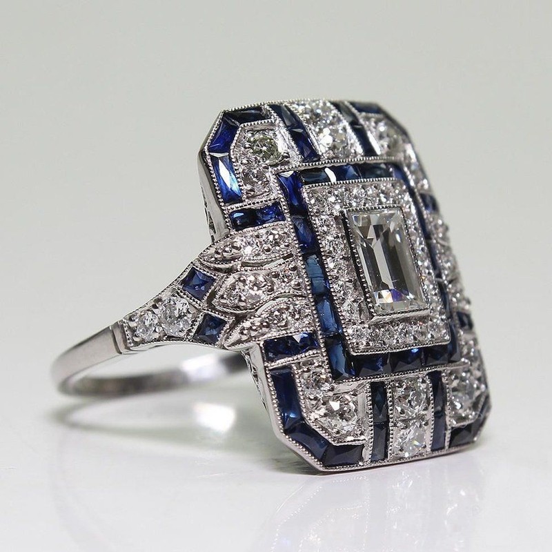 Details About Art Deco Large 925 Jewelry Sterling Silver Blue Sapphire Diamond Ring Hot
