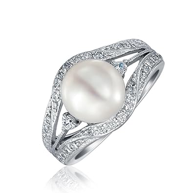 Art Deco Style Freshwater White Cultured Pearl Engagement Ring For Women Pave Triple Split Band 925 Sterling Silver